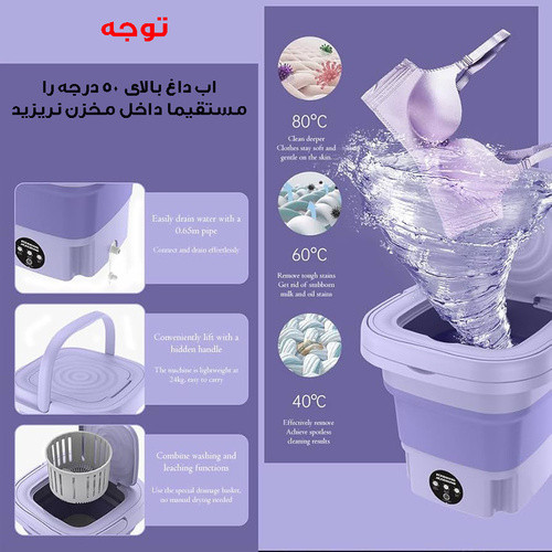 لباسشویی جمع شو (مینی واش) دارای خشک کن و شیر تخلیه یک محصول فوق العاده کاربردی مناسب برای سفر و استفاده در خانه برای صرفه جویی در زمان و هزینه آب و برق است . این محصول مناسب شست و شوی سریع و راحت لباس های ساده مثل جوراب و لباس زیر و لباس کودک است که با لکه بری قدرتمند با کم ترین مصرف آب و برق است.