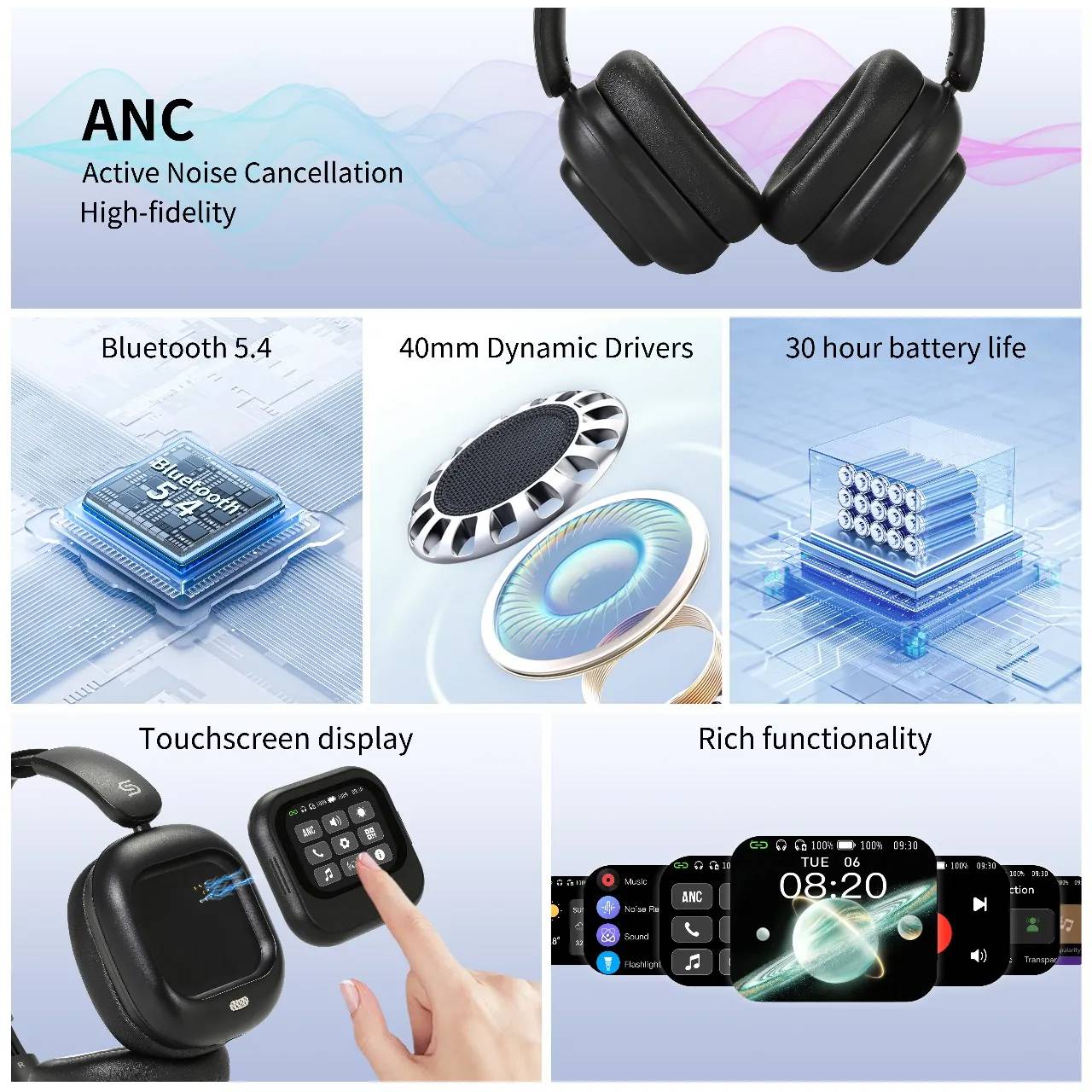 1 کنترل صفحه لمسی 2 کاهش نویز 3 بلوتوث 5.4 4 صدای فراگیر 5 میکروفون داخلی 6 شارژ نوع C 7 طراحی جمع و جور و تاشو 8 فناوری ANC ترکیبی 9 29 ساعت زمان پخش 10 درایور قدرتمند 40 میلیمتری 11 کنترل لمسی مغناطیسی