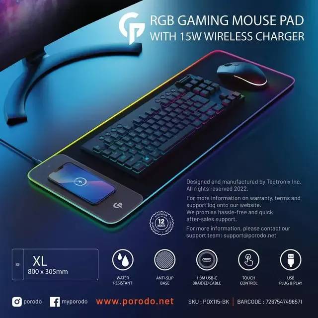 با شارژر بیسیم 15 واتی Porodo Gaming که همراه دستگاه ارائه میشود، میتوانید بدون دردسر گوشی هوشمند یا هدفون خود را هنگام کار یا بازی شارژ کنید.