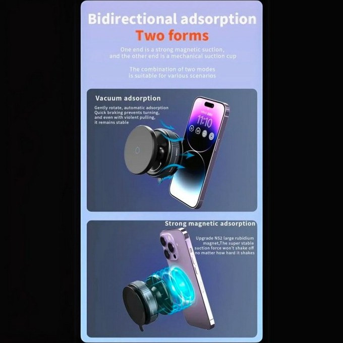 این هولدر با فن آوری مکش پیشرفته و خیلی خیلی قوی که داره با ایجاد خلأ باعث چسبندگی بسیار ایمن و پایدار میشه و مانع از لرزش و افتادن گوشی شما میشه
